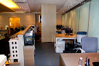 A munkaállomások a terület hátsó részén húzódnak végig; innen intézi a bérbeadó csapat a hívásokat és írják az ajánlatokat. Kevés személyes tárgy található az asztalokon, sugallva azt, hogy itt a munka az elsődleges (ennek ellenére egy golfszett el van rejtve az irattárolók közt, jó idő esetére indulásra készen).